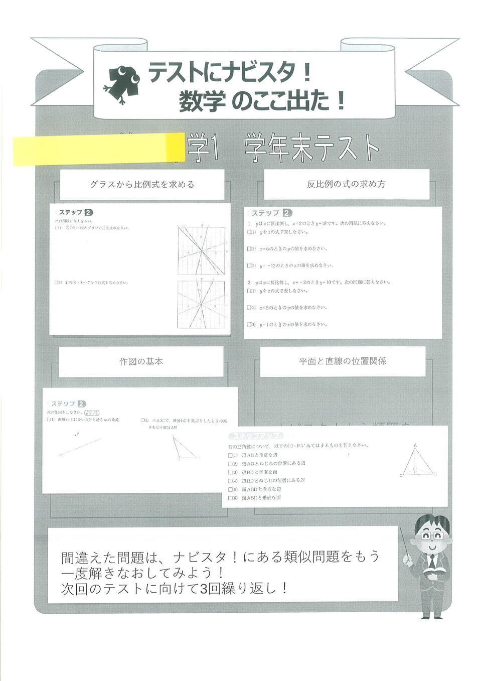 添付した写真からも分かるように、今年の第四回定期テスト(以前の学年末テスト)に、ナビのテキストからも類似問題が数多く出題されました。