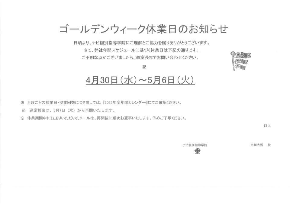 ゴールデンウィーク期間中の営業について ご案内いたします。