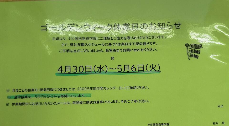 今回はゴールデンウィーク休業日のお知らせをさせていただきます。