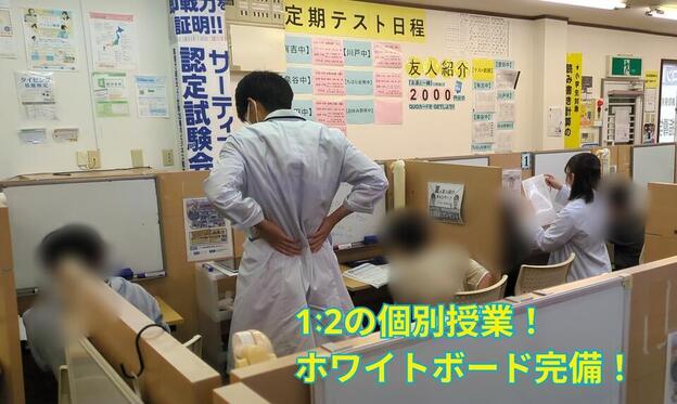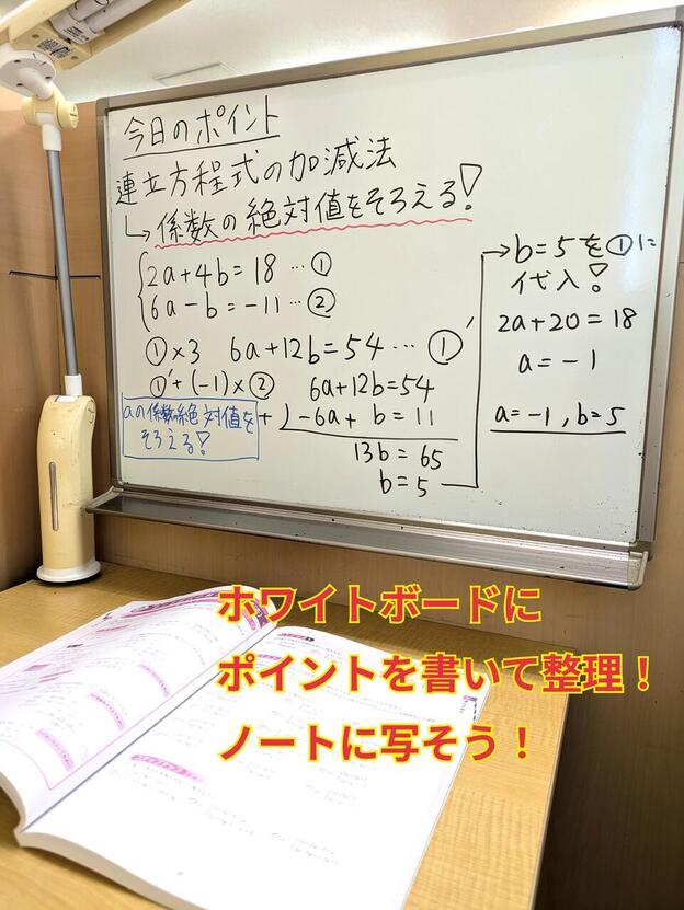 ナビ個別指導学院の授業は、個別の席ごとに設置された自分専用のホワイトボードで解き方や考え方を一緒に確認、それから生徒が問題を解くという「個別授業」スタイルです。