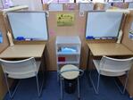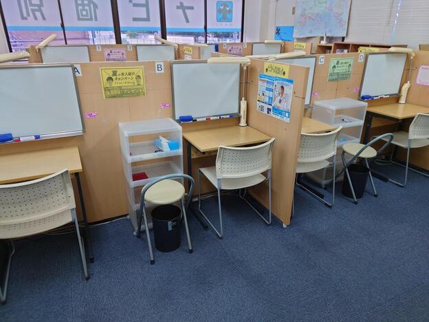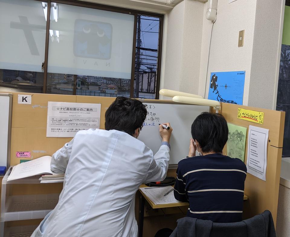 ナビ個別指導学院の授業は、個別の席ごとに設置された自分専用のホワイトボードで解き方や考え方を一緒に確認、それから生徒が問題を解くという「個別授業」スタイルです。