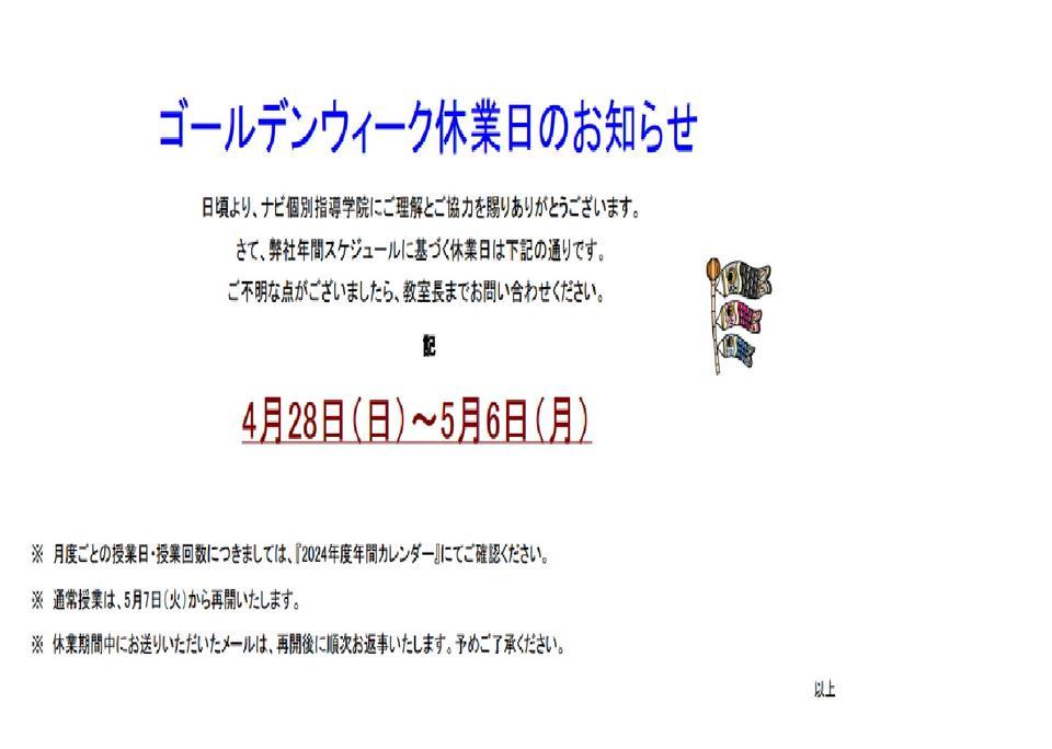 4月28日(日)~5月6日(月)までの期間はゴールデンウィーク休業日となっており、教室はお休みになります。