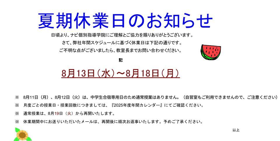 ※8月11日(月)、12日(火)は、中学生合宿専用日の為、通常授業はありません。