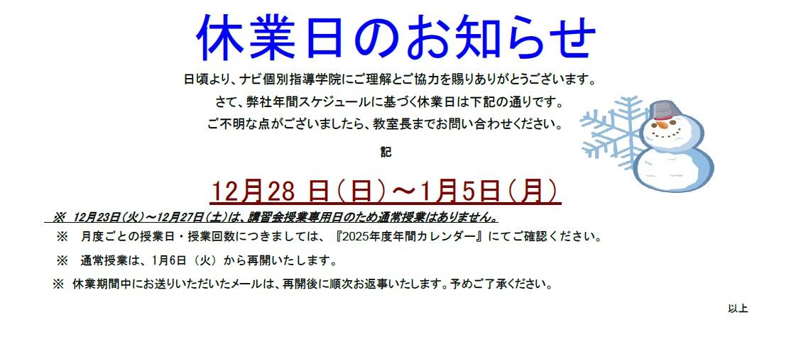 弊社年間スケジュールに基づく冬期休業日は以下の通りとなります。