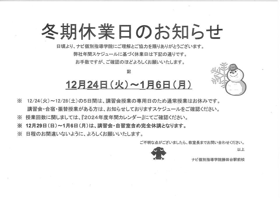 新年は1月7日(火)から開講いたしますので、よろしくお願いいたします。
