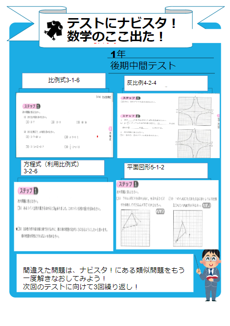 今回も同じくナビ個別の自社教材「ナビスタ!」と近隣中学校の後期中間テストの