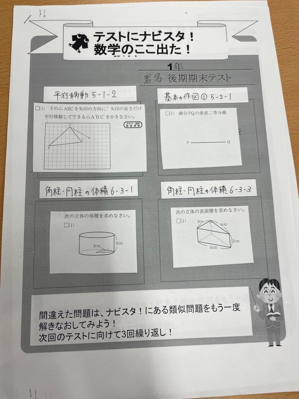 そこで今回は、ナビ個別の自社教材「ナビスタ!」と近隣中学校の前回定期テストの