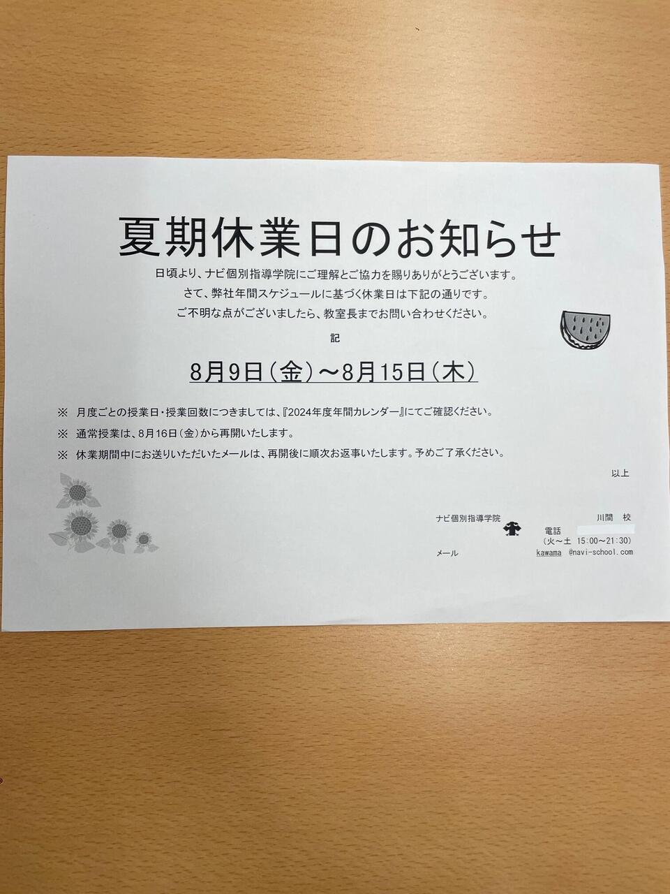 8/9(金)~8/15(木)は夏期休業日となっており、授業がお休みとなっております。