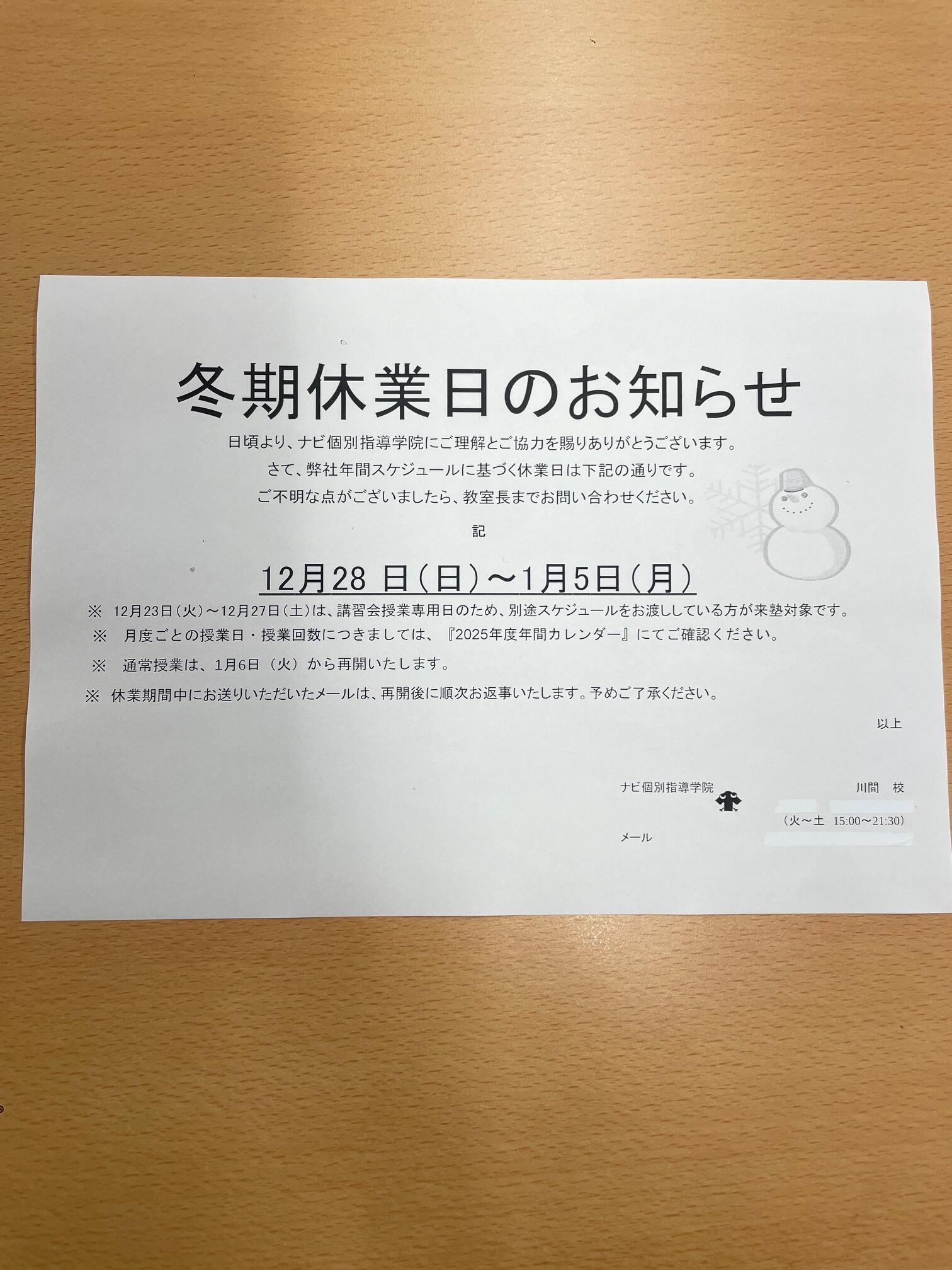 ※12月23日(日)~12月27日(土)は講習会授業のため、別途スケジュールをお渡ししている方が来塾対象です。