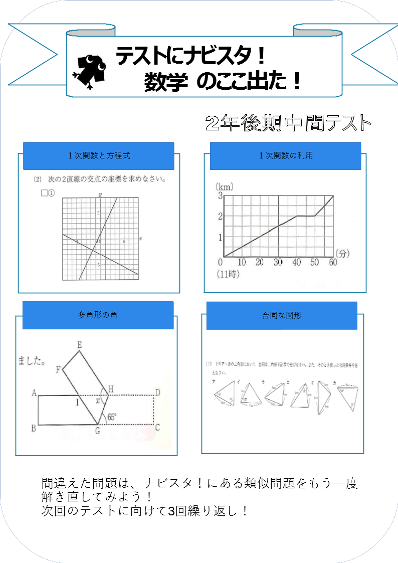 「1次関数」と「角度」「合同(基本のみ)」がテストの主な範囲でした。