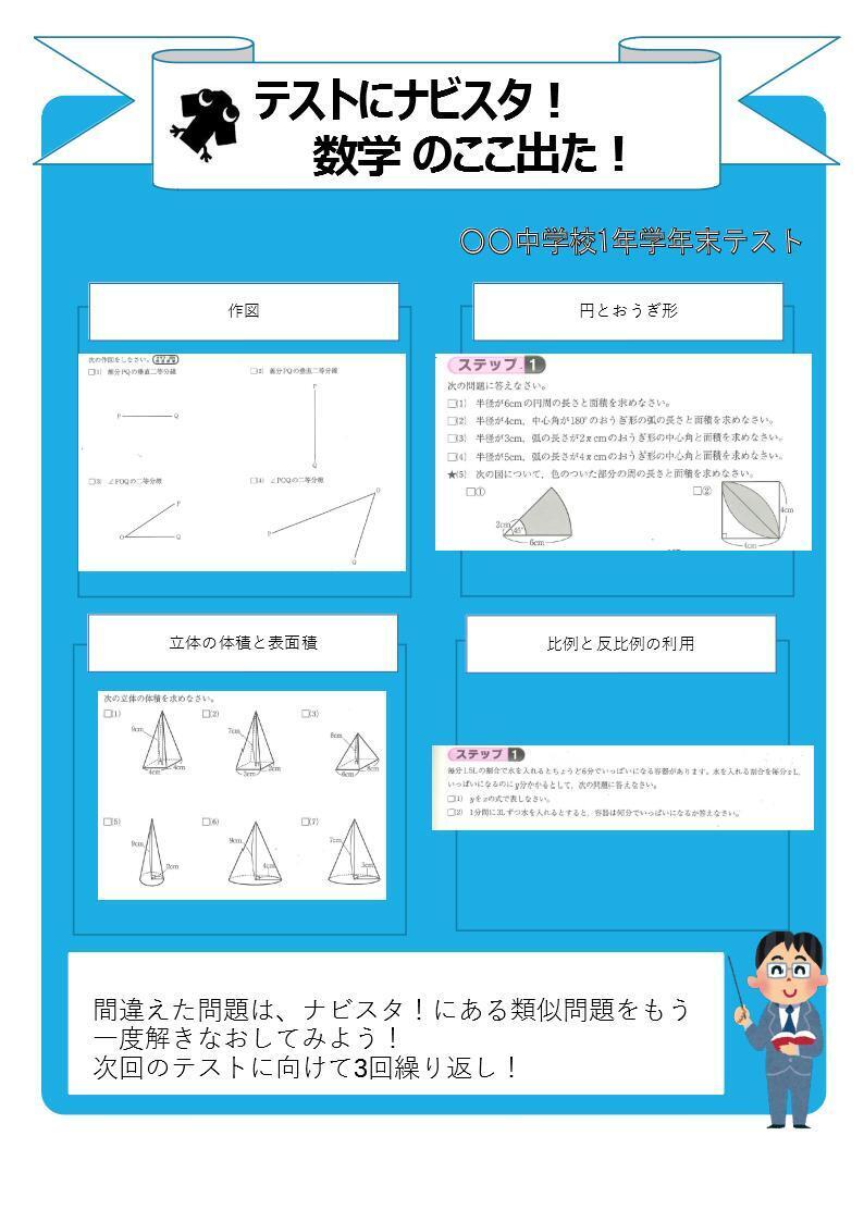そこで、ナビ個別の自社教材「ナビスタ!」と近隣中学校の前回定期テスト<数学>の