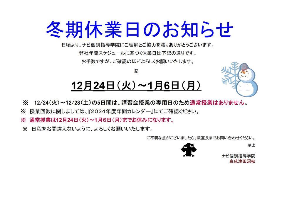 当塾では、12月29日(日)~1月6日(月)まで、冬期休業をいただきます。
