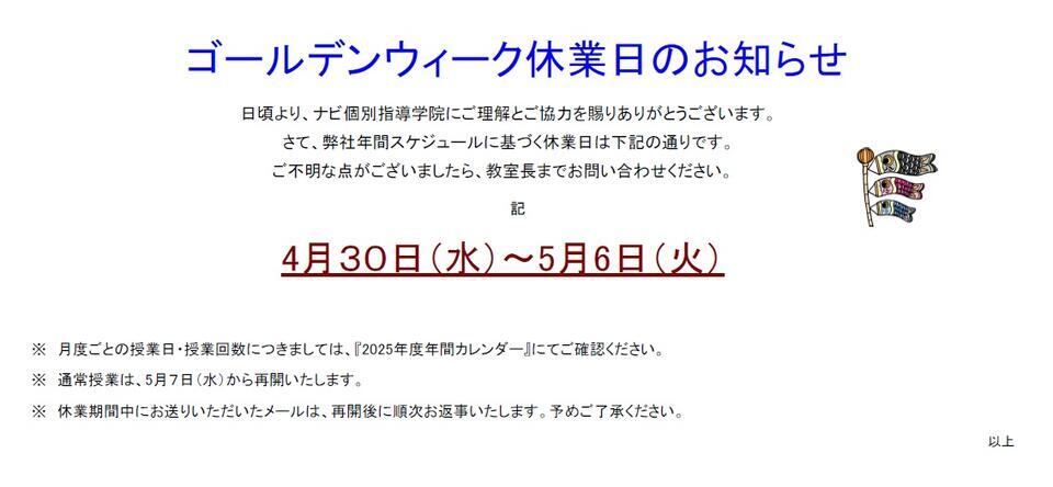 日頃より、ナビ個別指導学院にご理解とご協力を賜りありがとうございます。