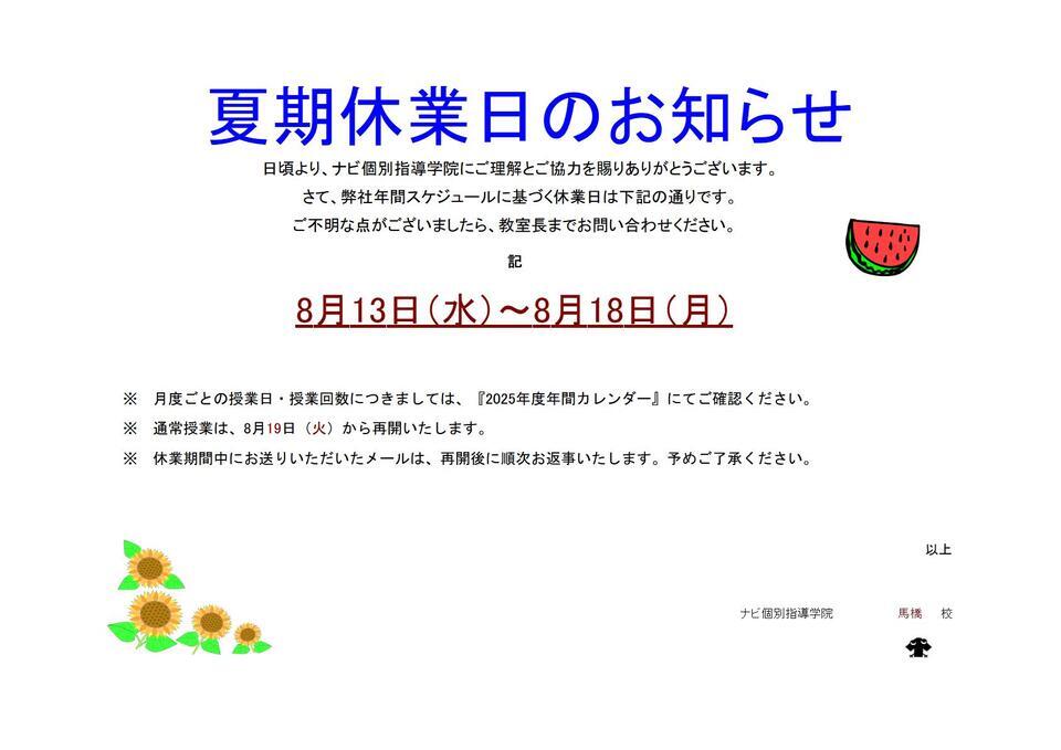 ナビ個別指導学院馬橋校は【 2025/08/13㈬~2025/08/18㈪ 】の期間にてお休みをいただきます。