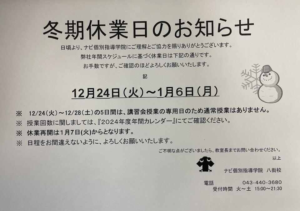 なおナビ個別指導学院八街校は、12月29日(日)から1月6日(月)まで休校となります。