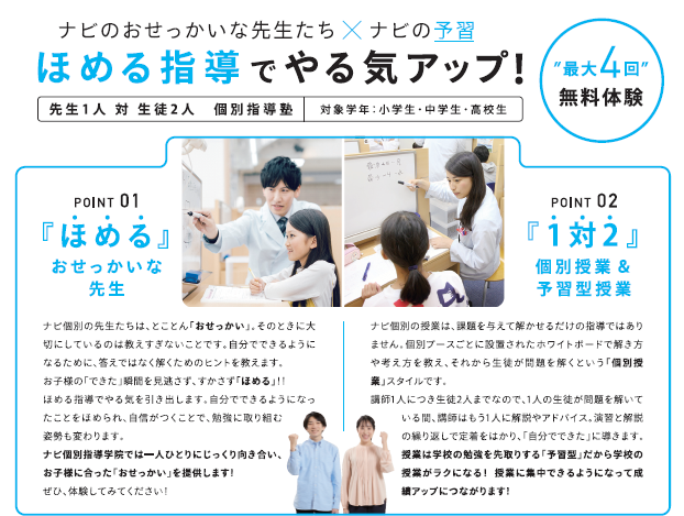 しかし、定期テストなどは上記にあげたことの質と量を追っていけば自ずと効果は見えてきます。ナビでは生徒一人一人に沿った形でそれをサポートさせていただいておりますので、是非お気軽にご相談ください!