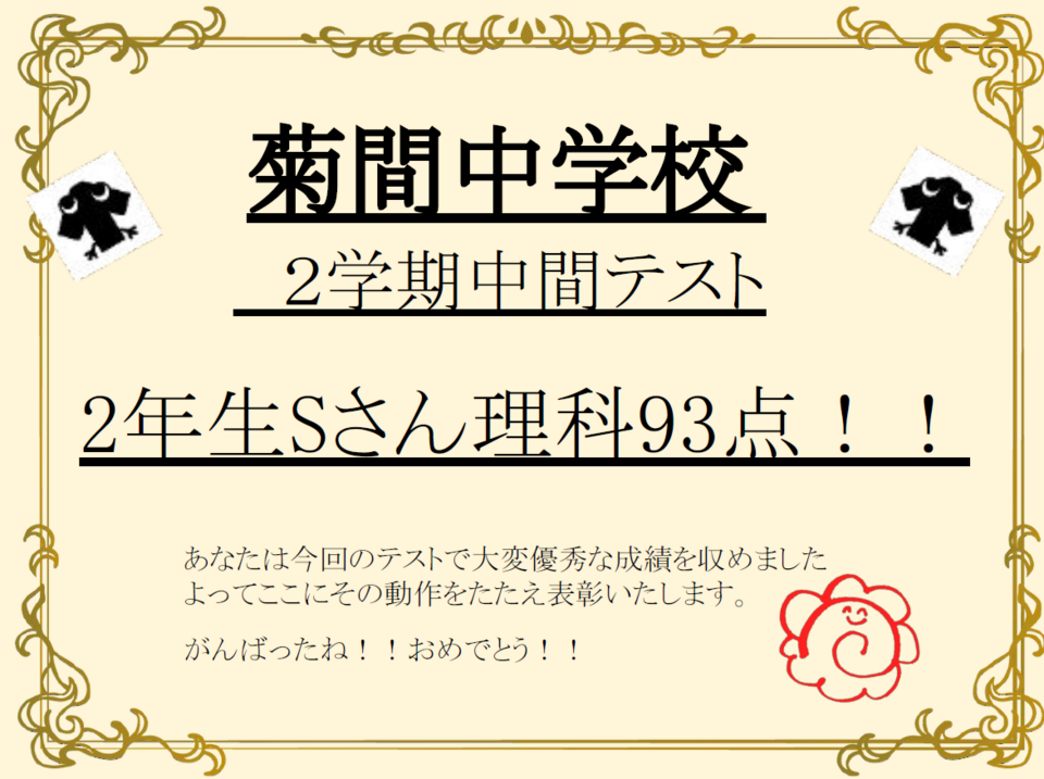 宿題も自習もよく頑張っていた姿が印象的です!特に、テスト前に自習室に来て苦手な単元の練習と質問をたくさんしてくれました。ありがとう!結果につながってよかったね!