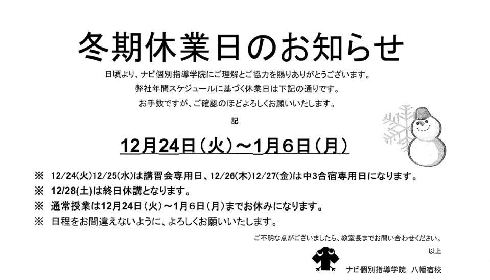 ※12/26(木),12/27(金)に関しましては、中3生講習合宿専用日の為、通常授業はお休みです。