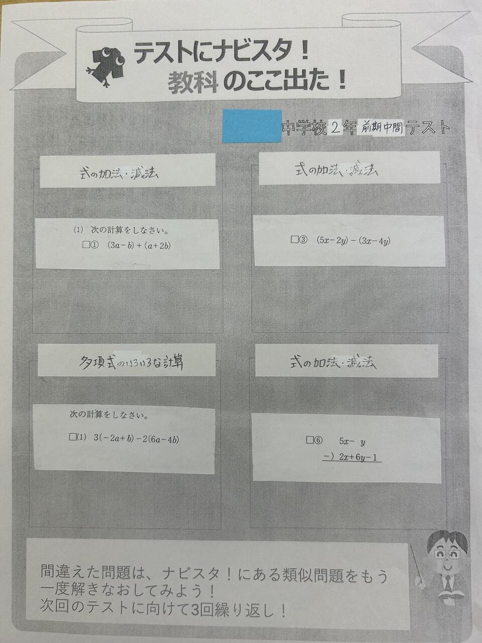 そこで、ナビ個別の自社教材「ナビスタ!」と近隣中学校の昨年前期中間テストの分析を