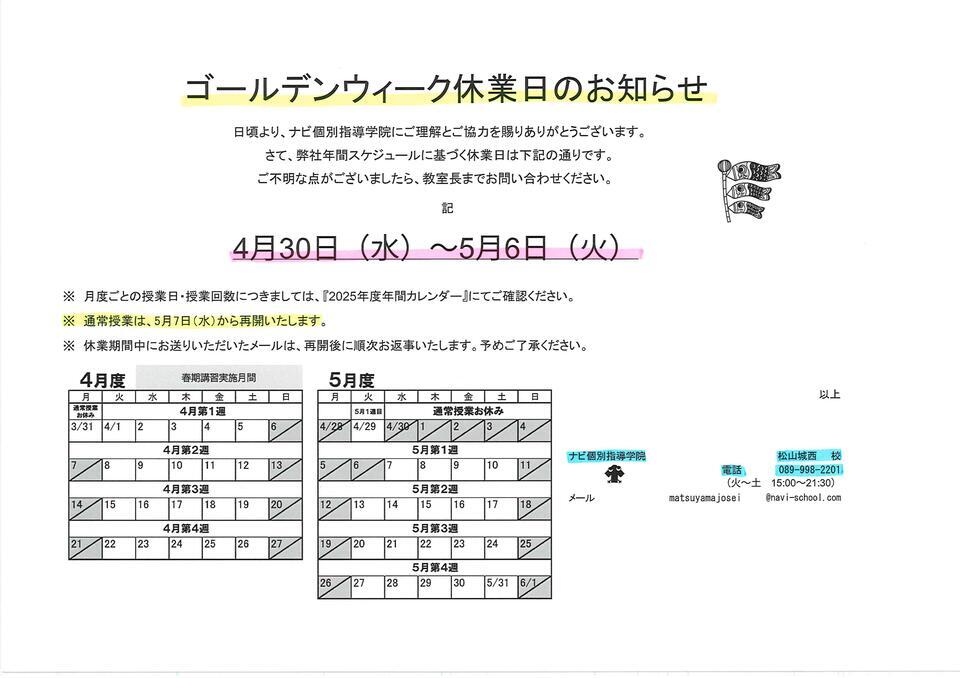 GW休業日 4月30日(水)~5月6日(火)