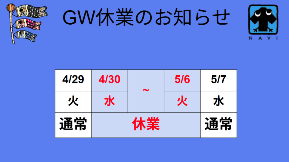 GW休業日 4月30日(水)~5月6日(火)