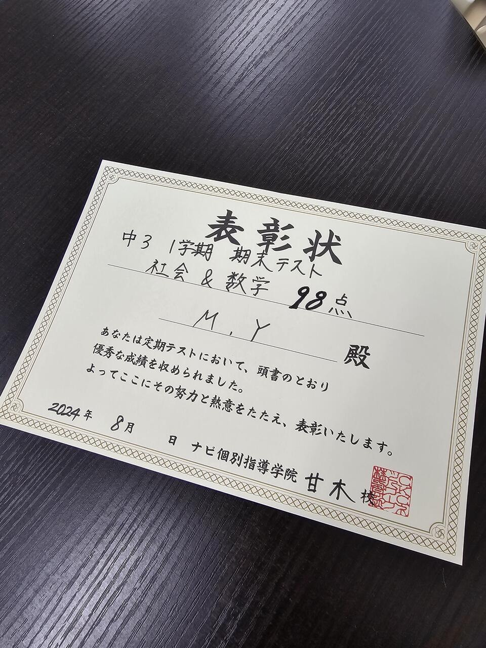 今回は1学期期末テストで好成績を取った中学3年生を紹介します。