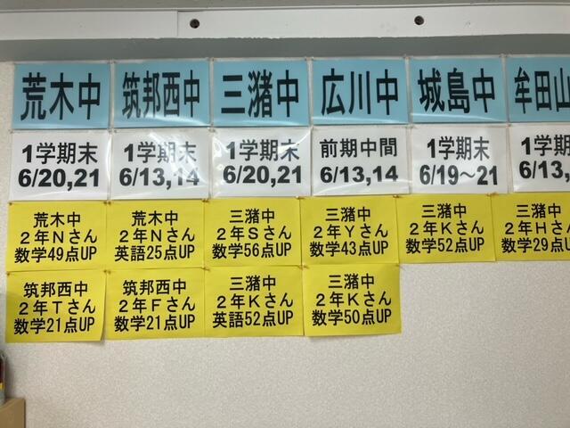さてここでナビ個別荒木校の生徒さんの頑張りを公表します!1学期末試験の結果が前回の試験(前の学年の学年末試験)からどれくらい上がったかを見てましょう!通常授業の受講科目である英語や数学を中心に皆さん方大幅に点数UPしております。伸び幅がすごい方は50点近く点数が上がりました。素晴らしいですね!