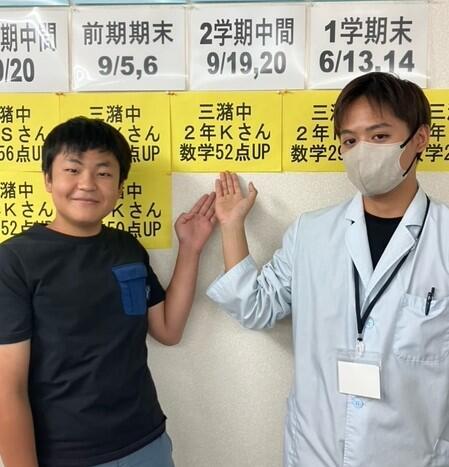 三潴中学校2年生のKくんです。学校の予習をして、定期試験前は定期試験範囲を3回繰り返すというナビの通常授業のスタイルが、ピッタリはまりました!数学も英語も50点以上UPはとてもすごいことですよね!