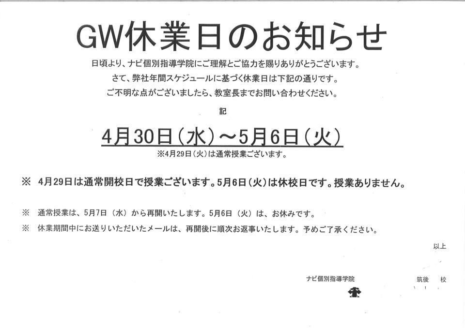 GW休業日 4月30日(水)~5月6日(火)