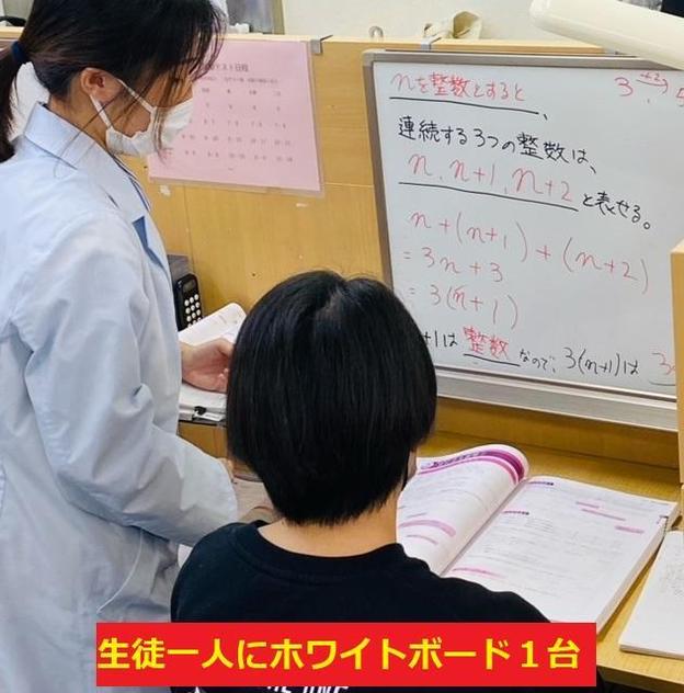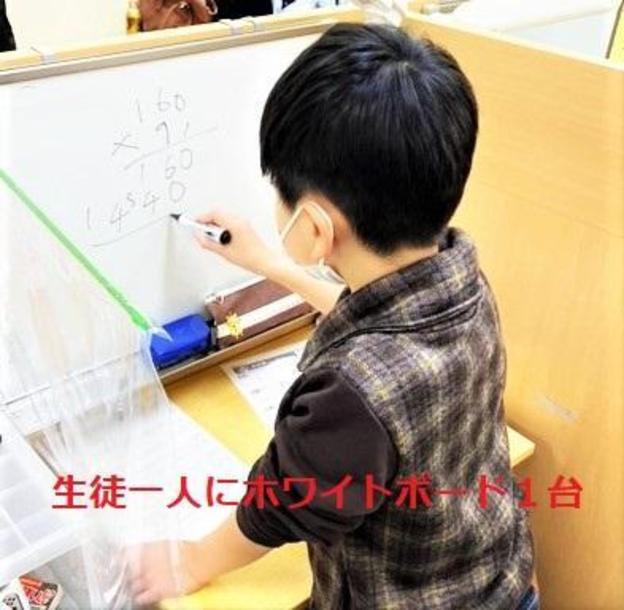 ナビ個別指導学院の授業は、個別の席ごとに設置された自分専用のホワイトボードで解き方や考え方を一緒に確認、それから生徒が問題を解くという「個別授業」スタイルです。