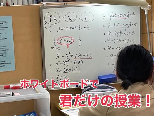 ナビ個別指導学院の授業は、個別の席ごとに設置された自分専用のホワイトボードで解き方や考え方を一緒に確認、それから生徒が問題を解くという「個別授業」スタイルです。