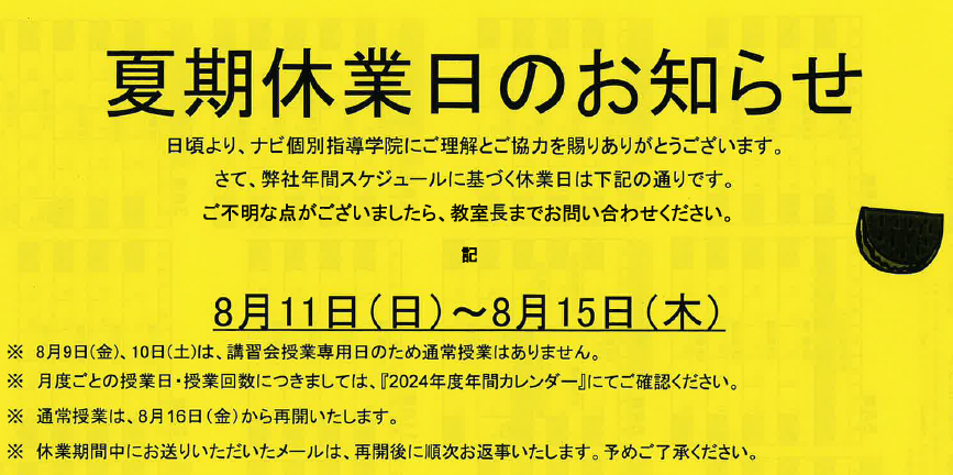 夏期休業のため塾がお休みとなっております。