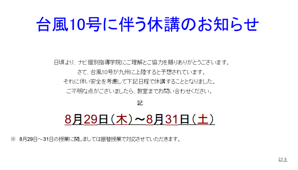 台風10号接近に伴い臨時休校いたします。