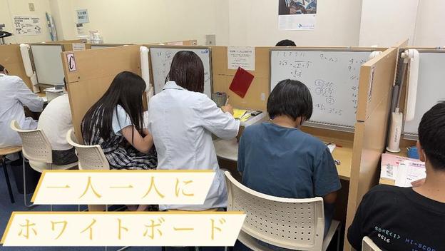 ナビ個別指導学院の授業は、個別の席ごとに設置された自分専用のホワイトボードで解き方や考え方を一緒に確認、それから生徒が問題を解くという「個別授業」スタイルです。