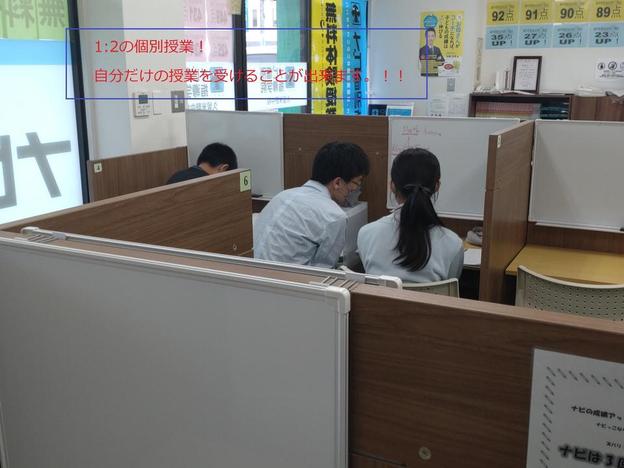 ナビ個別指導学院の授業は、個別の席ごとに設置された自分専用のホワイトボードで解き方や考え方を一緒に確認、それから生徒が問題を解くという「個別授業」スタイルです。