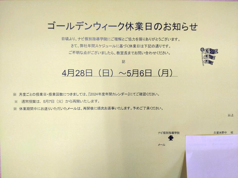 GW期間である、4/28(日)~5/6(月)は休業となっています。