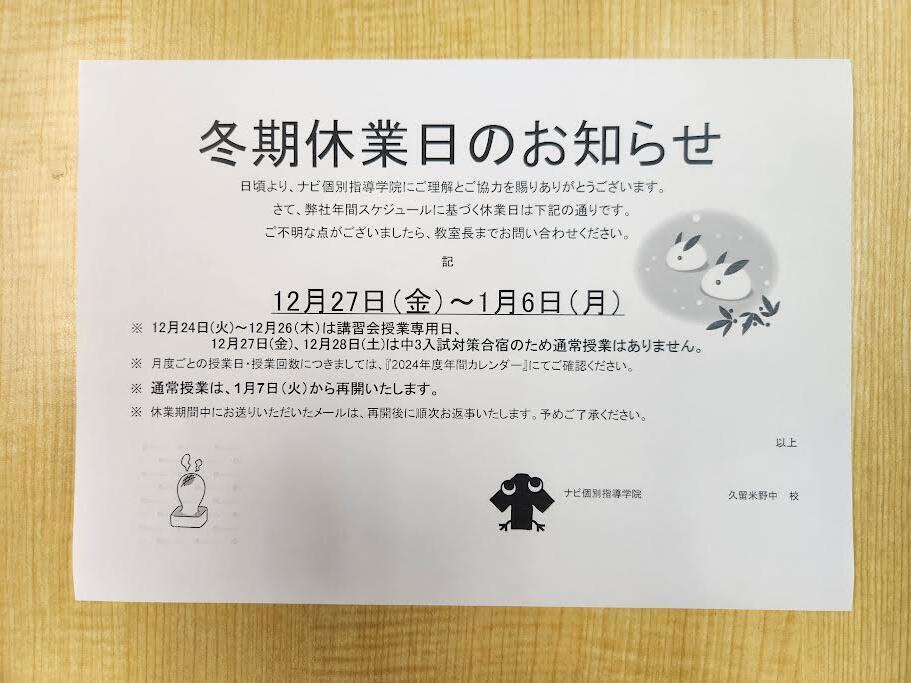 12/29(日)~1/6(月)は冬期休業になります。
