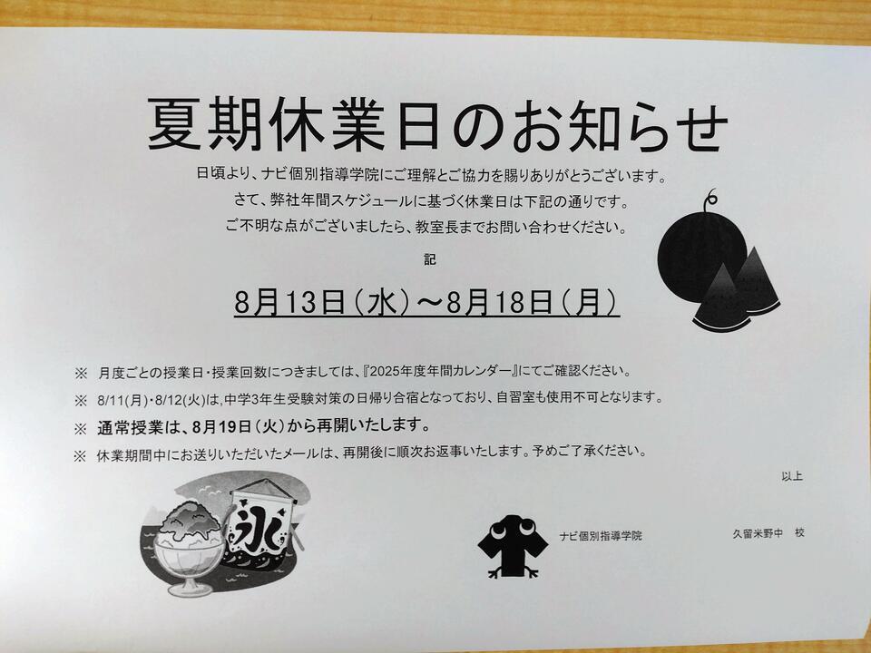 当塾は、8月13日(水)から8月18日(月)は、夏期休業となります。