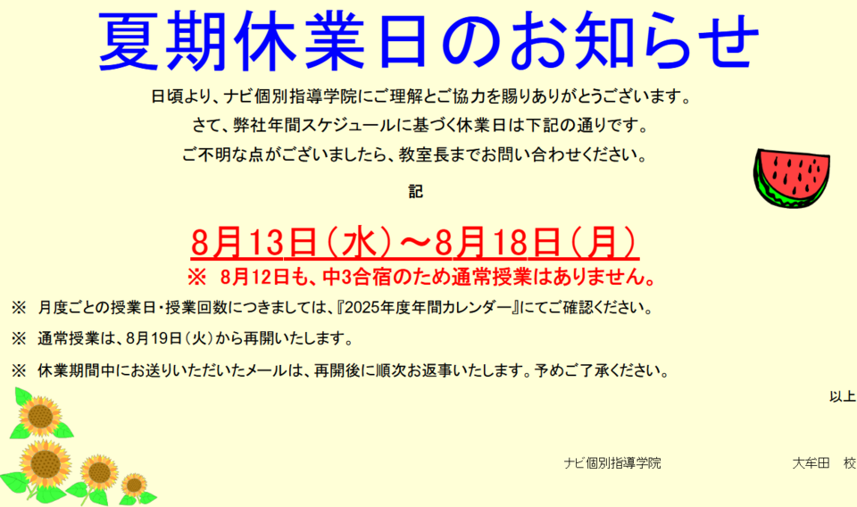 ナビ個別の年末年始のスケジュールについてお知らせです。