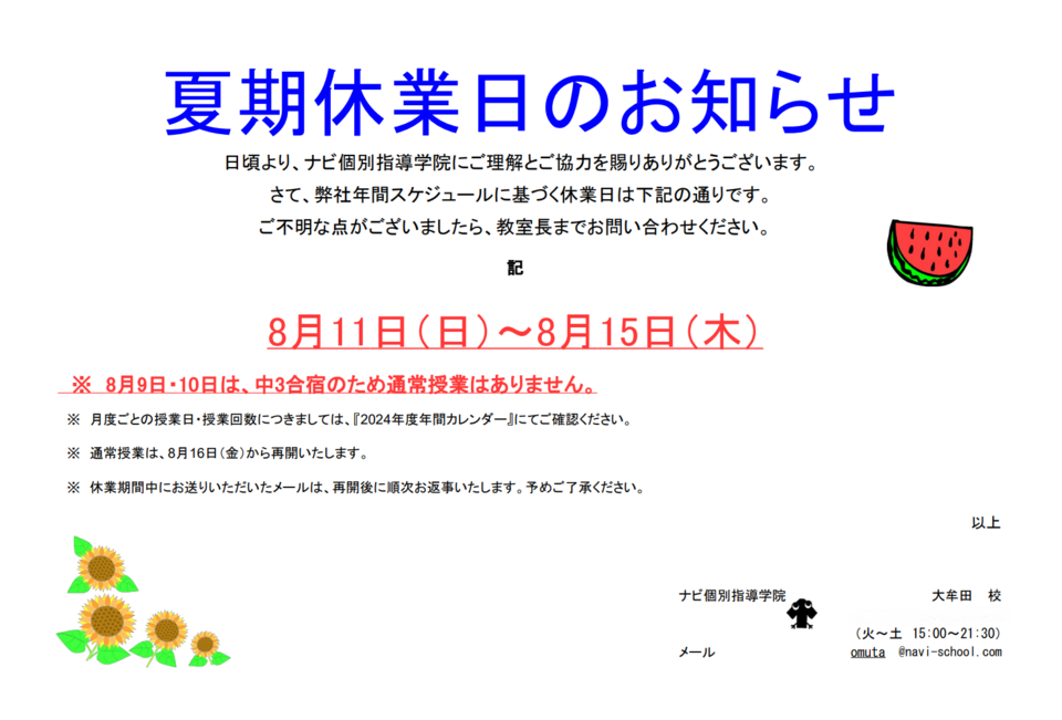 ※8/9(金)・10(土)も通常授業はございません。※自習室などもご利用いただけません。