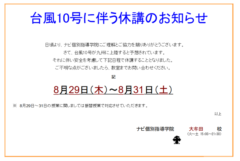 臨時休校:2024年8月29日(木)から31日(土)まで