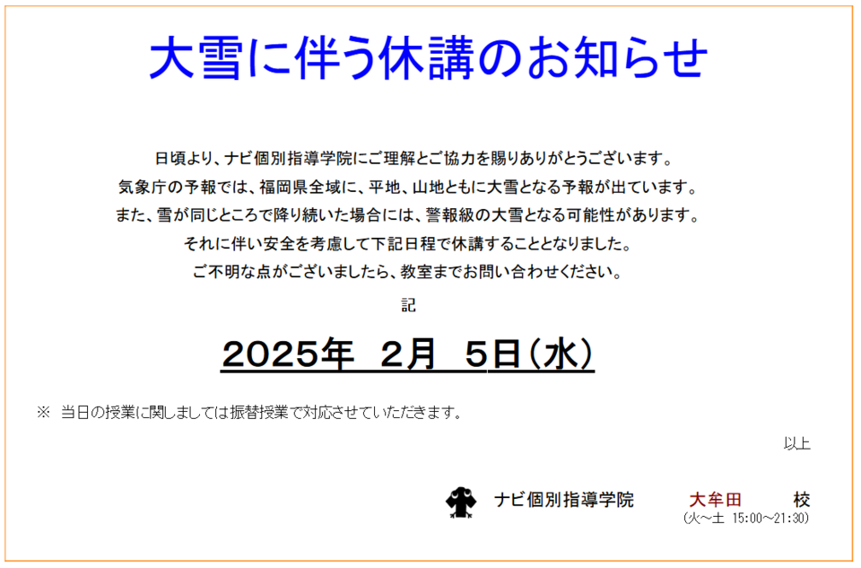このたび、大雪の予報を受けまして、みなさまの安全等を考慮した結果、