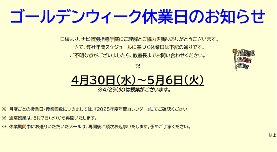 ナビ個別のゴールデンウィーク休業期間のお知らせです。