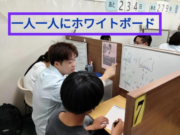 ナビ個別指導学院の授業は、個別の席ごとに設置された自分専用のホワイトボードで解き方や考え方を一緒に確認、それから生徒が問題を解くという「個別授業」スタイルです。