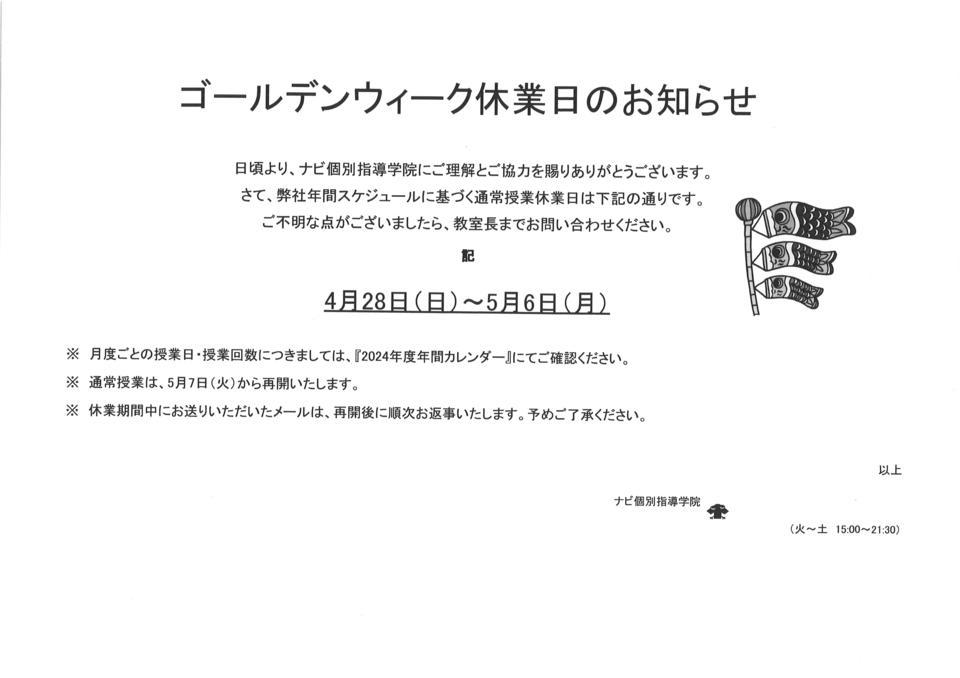 ゴールデンウィーク休業のお知らせです。