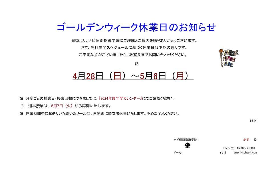 2024年4月28日(日)から2024年5月6日(月)のおよそ1週間は通常授業・講習会授業はございません。