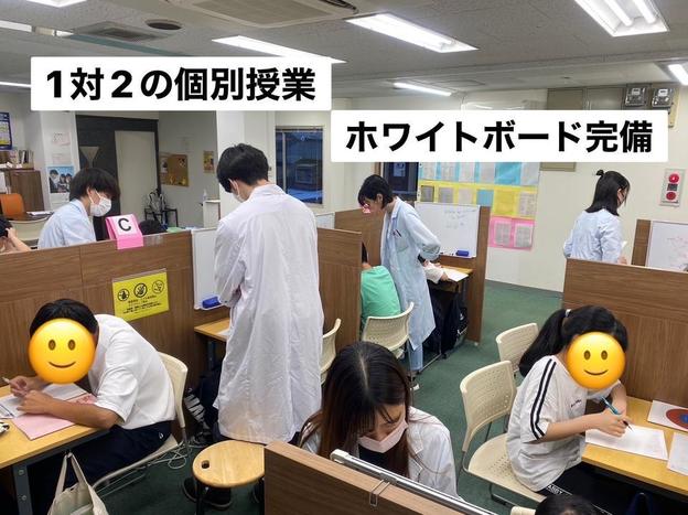 ナビ個別指導学院の授業は、個別の席ごとに設置された自分専用のホワイトボードで解き方や考え方を一緒に確認、それから生徒が問題を解くという「個別授業」スタイルです。