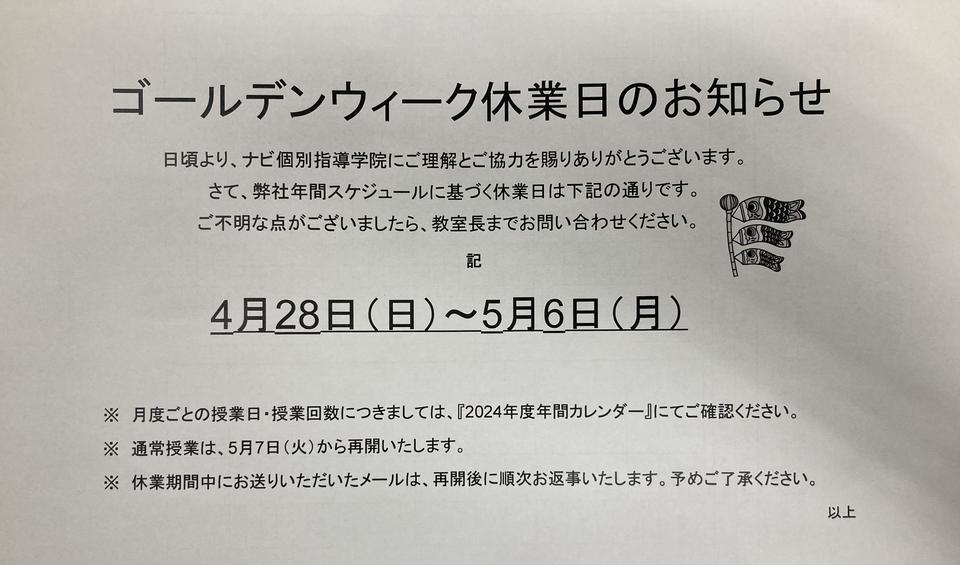 ナビのゴールデンウィークの休業期間のお知らせです。