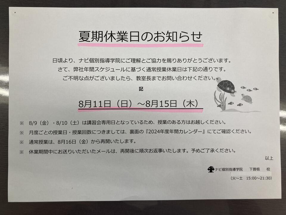8/11(日)~8/15(木)は夏期休業日となっております。