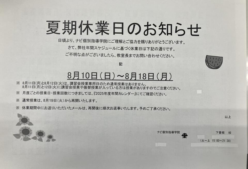 8月10日(日)~8月18日(月)は夏期休業日となっております。